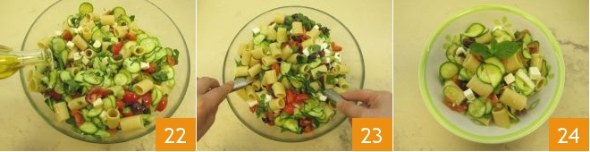 Würzt mit dem restlichen Öl 22 und mischt erneut 23, bevor ihr anrichtet 24. Eure kalte Zucchini-Pasta ist bereit, genossen zu werden!