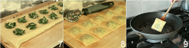 Den Teig mithilfe eines Nudelholzes oder einer Nudelmaschine bis zur dünnsten Stufe ausrollen. Kleine Häufchen der Füllung auf den ausgerollten Teig setzen 7 und die Ravioli mit einem speziellen Rädchen ausschneiden 8 und auf eine bemehlte Fläche legen. Die Ravioli in reichlich gesalzenem Wasser kochen. Abgießen, in eine Pfanne mit etwas geschmolzener Butter geben 9 und vorsichtig wenden, um sie glänzend zu machen. Heiße Ravioli auf einem 'Bett' aus Kartoffelsamtsauce servieren.