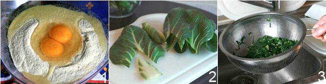 Mehl zu einem Hügel formen; in die Mitte eine Mulde drücken und die Eier hineinschlagen 1. Eine Prise Salz hinzufügen und kneten, bis ein glatter und elastischer Teig entsteht. Mit Frischhaltefolie abdecken und mindestens 30 Minuten im Kühlschrank ruhen lassen. Für die Füllung die Mangoldblätter gründlich reinigen. Den mittleren, härteren Teil jedes Blattes entfernen 2 und den Rest in Streifen schneiden. Die Mangoldstreifen in leicht gesalzenem kochendem Wasser 5 Minuten oder bis sie weich sind kochen. Abgießen und gut ausdrücken 3.