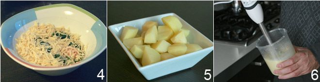 In einer Schüssel Mangold, geriebenen Bitto und ein Ei mischen 4; mit Salz und Pfeffer abschmecken. Die Kartoffeln schälen, in Würfel schneiden 5 und in reichlich leicht gesalzenem Wasser 15 Minuten oder bis sie weich sind kochen. Abgießen und zu einem Püree verarbeiten 6; Milch, Salz und Pfeffer nach Belieben hinzufügen.