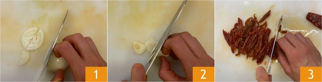 Um das Kaninchen im Eintopf mit Oliven und getrockneten Tomaten zuzubereiten, lassen Sie zunächst die getrockneten Tomaten gut abtropfen und bereiten Sie die Gemüsebrühe nach unserem Rezept zu. Schneiden Sie sowohl die Zwiebel 1 als auch den Knoblauch 2 in Scheiben. Schneiden Sie die getrockneten Tomaten der Länge nach 3.