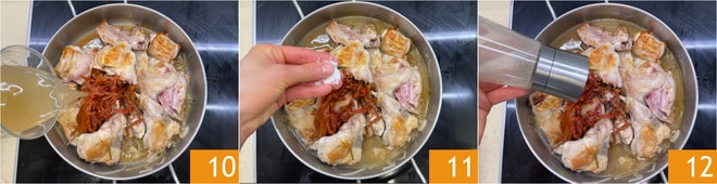 Gießen Sie die Brühe in den Topf 10, würzen Sie mit Salz 11 und Pfeffer 12.