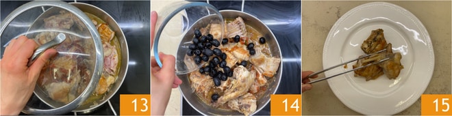 Mischen Sie, decken Sie mit einem Deckel ab 13 und lassen Sie es bei niedriger Hitze etwa 40 Minuten köcheln oder bis das Kaninchen zart ist, bei Bedarf können Sie während des Kochens mehr Brühe hinzufügen. In den letzten 5 Minuten des Kochens die Oliven hinzufügen 14 und ein letztes Mal umrühren. Anrichten 15.