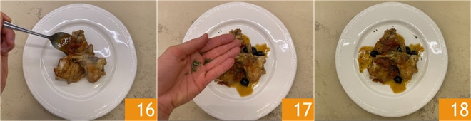 Vervollständigen Sie mit etwas Kochfond 16 und gehacktem Rosmarin 17. Das Kaninchen im Eintopf mit getrockneten Tomaten ist bereit, heiß serviert zu werden 18.