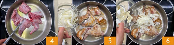 In einem Topf erhitzen Sie das Öl und fügen das Kaninchen hinzu 4, braten Sie es bei mittlerer Hitze von allen Seiten an, bis es goldbraun ist, das dauert etwa 5-10 Minuten. Geben Sie dann die Zwiebel 5 und den Knoblauch 6 dazu.