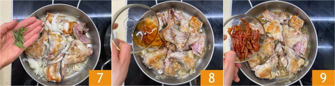 Fügen Sie den Rosmarin hinzu 7 und löschen Sie mit dem Marsala ab 8. Mischen Sie und lassen Sie den Alkohol vollständig verdampfen. Zu diesem Zeitpunkt fügen Sie die getrockneten Tomaten hinzu 9.