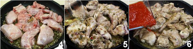 dann fügen Sie die Kaninchenstücke hinzu und lassen Sie sie goldbraun werden 4. Geben Sie den Weißwein dazu 5, den Sie verdampfen lassen, dann fügen Sie die Tomaten hinzu 6, salzen und pfeffern Sie und decken Sie mit einem Deckel ab.