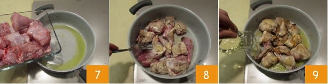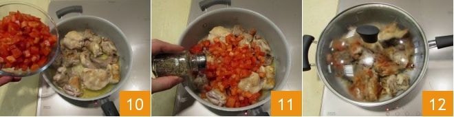 und wenn der Wein vollständig verdampft ist, fügen Sie die gewürfelten Tomaten hinzu 10, würzen Sie mit Salz und Pfeffer 11 und lassen Sie das Ganze etwa 30 Minuten mit Deckel kochen 12, dabei gelegentlich die Fleischstücke umrühren und wenden.
