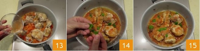 Wenn das Fleisch zu trocken zu werden scheint, können Sie während des Kochens etwas Wasser hinzufügen (Sie können die gleiche Schüssel verwenden, die Sie zum Sammeln der gewürfelten Tomaten verwendet haben) 13. Zum Schluss fügen Sie die von Hand zerrissenen Basilikumblätter hinzu 14 und schalten die Hitze ab. Die Soße sollte dick und glänzend sein; Ihr Kaninchen nach Ischitana-Art ist bereit, heiß serviert zu werden 15!