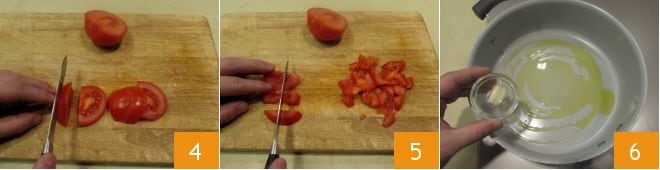 Schneiden Sie sie dann in Scheiben 4 und anschließend in Würfel 5 und sammeln Sie sie in einer kleinen Schüssel. Dann nehmen Sie einen Topf, geben das Öl und den geschälten und von der grünen inneren Seele befreiten Knoblauch hinein (so wird der Geschmack angenehmer) 6, lassen ihn bei niedriger Hitze einige Augenblicke anbraten und wenn der Knoblauch goldgelb, aber nicht verbrannt ist, entfernen Sie ihn