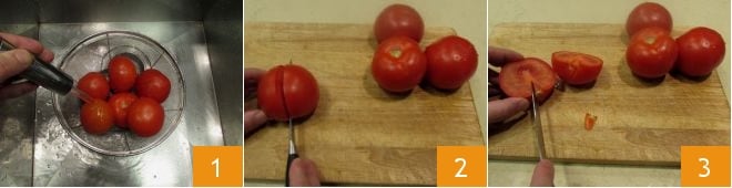 Um das Kaninchen nach Ischitana-Art zuzubereiten, beginnen Sie damit, die Tomaten unter frischem Wasser abzuspülen 1, dann trocknen Sie sie und teilen sie in zwei Hälften 2. Schneiden Sie die obere Hälfte der Tomate ein und entfernen Sie sie 3.