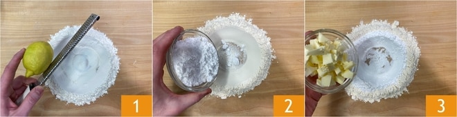 Um die Hasenkekse zuzubereiten, bereitet ihr zuerst den Mürbeteig zu. Gebt das Mehl auf die Arbeitsfläche und formt die klassische Fontäne, dann fügt die Schale einer Zitrone 1, den Puderzucker 2 und die Butter in Würfeln 3 hinzu.