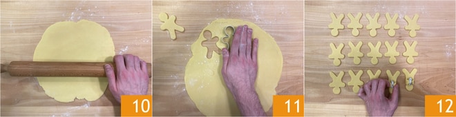 Rollt den Mürbeteig leicht bemehlt auf einer Arbeitsfläche aus 10 und stecht die Kekse mit einem Ausstecher in Form eines Lebkuchenmännchens (Gingerbread) aus 11; mit dieser Menge erhaltet ihr etwa 20. Legt sie umgekehrt, mit dem Kopf nach unten, und platziert die Kugel in die Mitte 12. Hebt die Arme an, um die Kugel "zu umarmen", ohne zu stark zu drücken.