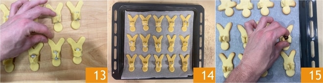 Formt die Beine des Männchens leicht spitz zu, damit sie wie Ohren aussehen 13. Legt sie auf ein Backblech 14 und backt sie im vorgeheizten statischen Ofen bei 180° für 15 Minuten. Nehmt sie heraus und entfernt die Alufolienkugel vorsichtig, solange sie noch heiß sind. Lasst sie vollständig abkühlen und platziert dann das Schokoladenei in die Mitte 15.