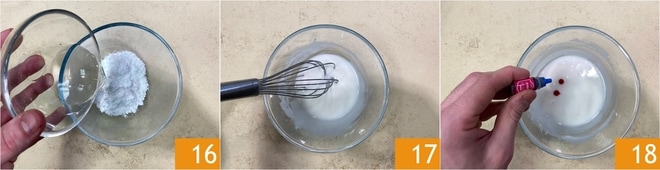 Bereitet jetzt die Glasur vor: In einer kleinen Schüssel Puderzucker und Wasser 16 vermischen, mit einem Schneebesen rühren 17 und den rosa Farbstoff hinzufügen 18.