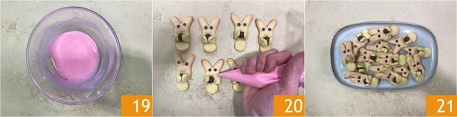 Noch einmal rühren, bis eine flüssige und gleichmäßige Glasur entsteht 19. Füllt sie in einen Spritzbeutel und verziert die Ränder der Häschen 20. Lasst die Glasur etwa eine Stunde aushärten und serviert eure Hasenkekse 21!
