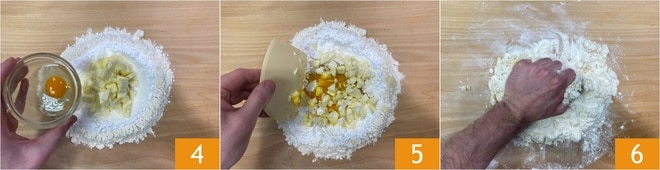 Fügt auch das Ei hinzu 4 und beginnt, zuerst mit einem Teigschaber 5 und dann mit den Händen 6 zu kneten.