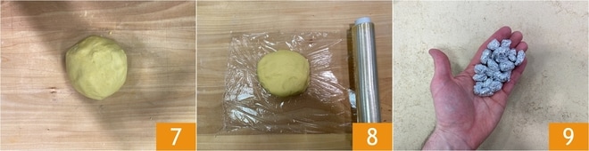 Der Teig sollte nicht zu lange bearbeitet werden; sobald er homogen ist 7, wickelt ihn in Frischhaltefolie 8 und lasst ihn 30 Minuten im Kühlschrank ruhen. Formt dann 30 Kugeln aus Alufolie, die genauso groß sind wie eure Schokoladeneier 9.
