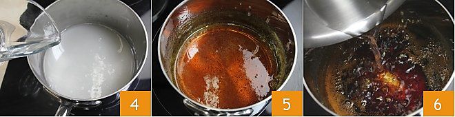 Nun widmen Sie sich der Füllung, beginnend mit der Zubereitung des Karamells: In einem ausreichend großen und dickwandigen Topf erhitzen Sie bei niedriger Hitze 120 g Zucker mit 25 ml Wasser 4; der dicke Boden ermöglicht eine gleichmäßige Wärmeverteilung, um zu verhindern, dass der Zucker verbrennt, bevor er karamellisiert. Wenn der Zucker eine schöne braune Farbe erreicht hat 5, fügen Sie weitere 50 ml heißes Wasser hinzu 6 und rühren Sie schnell um. Nehmen Sie die Karamellsauce vom Herd und lassen Sie sie bei Raumtemperatur abkühlen.