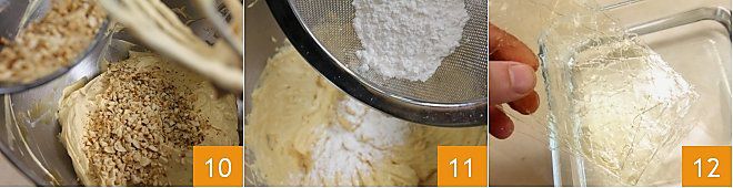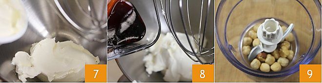 In einer Küchenmaschine mit Schneebesenaufsatz oder in einer Schüssel mit einem Handmixer oder einem elektrischen Mixer, machen Sie die Philadelphia-Creme weich 7 und fügen Sie nach und nach die Karamellsauce hinzu 8. In der Zwischenzeit hacken Sie die Haselnüsse in einem Mixer 9, wobei Sie ein paar ganze für die endgültige Dekoration beiseitelegen.
