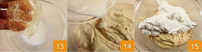Sobald die Gelatine weich ist, drücken Sie sie aus und lassen Sie sie in 2 Esslöffeln Sahne, die Sie von der Gesamtdosis genommen und leicht erwärmt haben, auflösen 13. Wenn die Mischung auf Raumtemperatur abgekühlt ist, fügen Sie die in der Sahne aufgelöste Gelatine der Creme hinzu 14. Schlagen Sie inzwischen die restliche Sahne steif (hier die Kochschule: wie man Sahne steif schlägt) und heben Sie sie vorsichtig mit einem Spatel von unten nach oben unter die Creme 15.