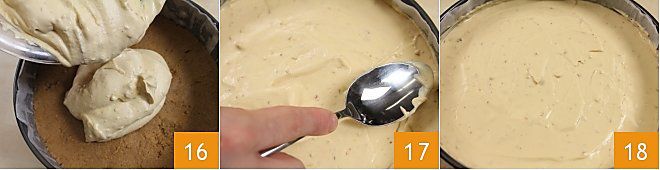 Die Philadelphia-Creme mit Karamell und Haselnüssen ist fertig: Holen Sie den inzwischen kalten Keksboden und verteilen Sie die Creme darüber 16, wobei Sie darauf achten, zwei Esslöffel der Masse für die endgültige Garnitur zurückzuhalten. Glätten Sie schließlich die Oberfläche mit einem Spatel oder der Rückseite eines Löffels und stellen Sie den Karamell-Haselnuss-Käsekuchen 18 mindestens 4 Stunden in den Kühlschrank, um ihn fest werden zu lassen. Nach der Ruhezeit formen Sie Ihren Käsekuchen aus und dekorieren Sie die Oberfläche mit beiseitegestellter Creme, die in einen Spritzbeutel mit Sterntülle gefüllt ist, und gehackten Haselnüssen, sowie an den Rändern mit den restlichen gehackten Haselnüssen. Hier ist Ihr Karamell-Haselnuss-Käsekuchen!