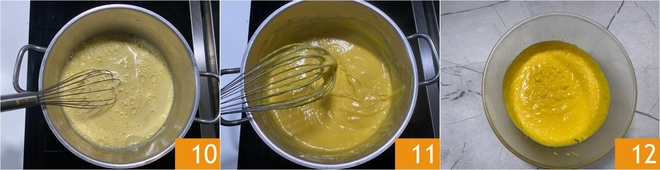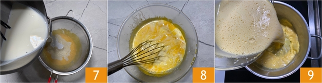 Gießen Sie die durch ein Sieb gefilterte heiße Milch in die Schüssel 7 und rühren Sie vorsichtig, um alles zu vermischen 8, dann geben Sie die Mischung zurück in den Topf 9.<\/p>