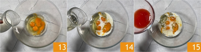 In der Zwischenzeit den Teig für die Berliner zubereiten: Die Eier in einer Schüssel mit der Milch 13, dem Pflanzenöl 14 und dem Orangensaft 15 verrühren.<\/p>