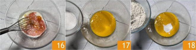 Vermischen Sie die flüssigen Zutaten mit einem Schneebesen 16. Nun die trockenen Zutaten hinzufügen: den Zucker 17 und das Weizenmehl 18.<\/p>