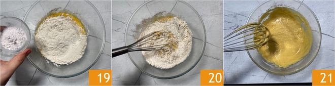 Fügen Sie auch das Backpulver 19 hinzu und verrühren Sie alles mit einem Schneebesen 20, um alle Zutaten gut zu vermischen, achten Sie dabei besonders auf die Ränder der Schüssel 21.<\/p>