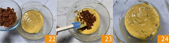 Nun die Rosinen 22 in den Teig geben und mit einem Spatel 23 gleichmäßig untermengen 24.<\/p>