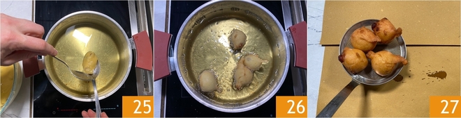 Sie sind bereit zum Frittieren: Erhitzen Sie das Pflanzenöl auf 160°C und lassen Sie den Teig mit Hilfe von 2 Löffeln in den Topf gleiten 25; um diesen Vorgang zu erleichtern, können Sie die Löffel vorher in das heiße Öl tauchen. Frittieren Sie maximal 4 Berliner gleichzeitig, um zu vermeiden, dass die Öltemperatur sinkt 26. Wenn sie schön goldbraun sind, etwa 4-5 Minuten, die Berliner auf Küchenpapier abtropfen lassen 27.<\/p>