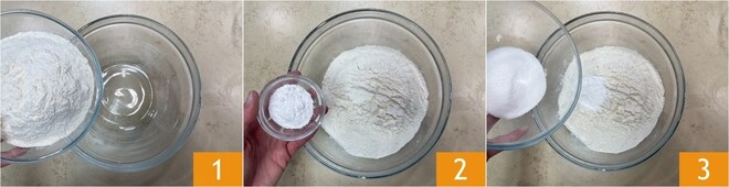 Um die Karnevals-Chiacchiere vorzubereiten: frittiert, im Ofen und gefüllt, bereitet zuerst den Teig zu. In eine Schüssel das Mehl 1, das Backpulver 2 und den Zucker 3 geben.