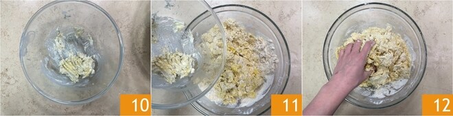 Sobald ihr eine Creme 10 erhalten habt, fügt sie dem Teig hinzu 11 und arbeitet weiter mit den Händen in der Schüssel 12.