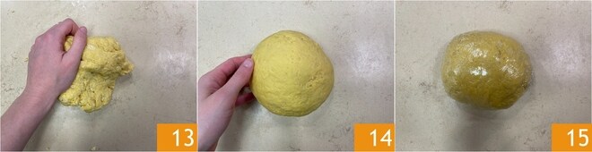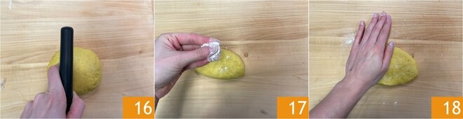 Wenn die Mischung beginnt, Form anzunehmen, sie auf eine Fläche geben 13 und weitere zehn Minuten kneten, bis ein glatter und homogener Teig entsteht 14. Er sollte fest, aber formbar sein. Sollte er zu hart sein, fügt 5-10 g Wasser hinzu. In Folie einwickeln und 30 Minuten bei Zimmertemperatur ruhen lassen 15.