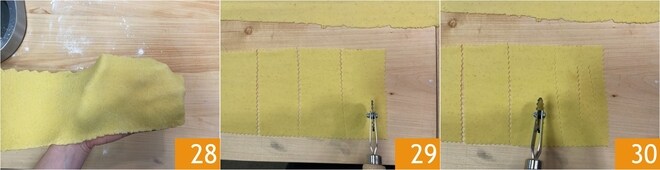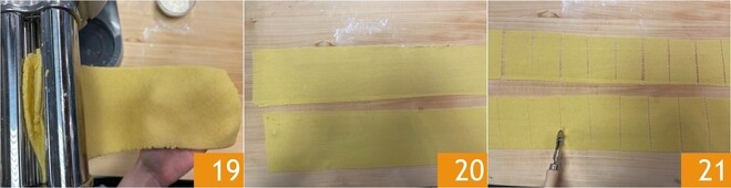 Lasst es dann mehrmals durch die Nudelmaschine laufen, wobei ihr die Dicke nach und nach reduziert 19 und den Teig vor dem erneuten Einführen faltet. Ihr solltet Streifen von 2 mm Dicke erhalten 20. Lasst die Blätter leicht trocknen, dann mit einem gezackten Teigrad Rechtecke von etwa 5x10 cm schneiden 21.