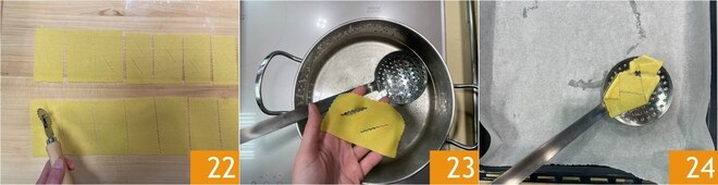 Macht in der Mitte schräge Einschnitte 22, dann die Chiacchiere in kochendem Wasser blanchieren 23, bis sie an die Oberfläche kommen. Dann mit einem Schaumlöffel abtropfen lassen und auf ein mit Backpapier ausgelegtes Blech legen 24.