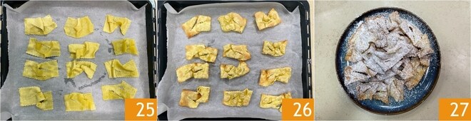 Versucht, ihnen mit den Händen etwas Bewegung zu geben, ohne sie vollständig zu glätten 25, und backt sie im vorgeheizten Umluftofen bei 200° für 5 Minuten auf einer Seite und 5 Minuten auf der anderen Seite. Wenn sie gut gebräunt sind, die Chiacchiere aus dem Ofen nehmen 26, abkühlen lassen und mit Puderzucker bestäuben 27.