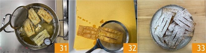 Frittiert wenige Chiacchiere gleichzeitig in reichlich heißem Pflanzenöl 31. Die ideale Temperatur liegt bei 150-160°, wir empfehlen euch, ein Thermometer zu verwenden, um eine perfekte Frittierung zu gewährleisten. Sobald sie gut gebräunt sind, mit einem Schaumlöffel abtropfen lassen und auf Küchenpapier transferieren 32. Abkühlen lassen und mit Puderzucker bestäuben 33.