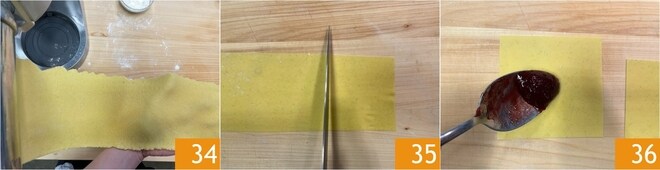 Zum Schluss zeigen wir euch, wie man die gefüllten und frittierten Chiacchiere zubereitet. Ihr müsst den Teig mehrmals durch die Nudelmaschine laufen lassen und die Dicke nach und nach reduzieren, bis ihr ein Blatt von 2 mm Dicke erhaltet 34. Daraus müsst ihr nur noch Quadrate von 10x10 cm schneiden und sie in der Mitte mit einem Teelöffel Marmelade füllen 36.