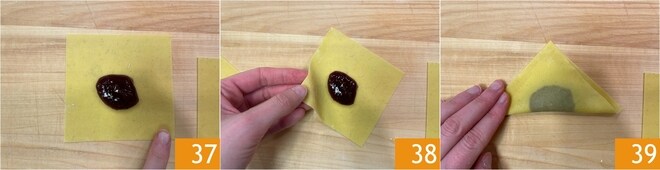 Nun die Ränder des Teigs anfeuchten 27 und das gefüllte Chiacchiere zu einem Dreieck falten 38. Die Ränder gut zusammendrücken und alle Luft herausdrücken 39. So alle weiteren vorbereiten.