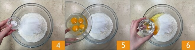 Fügt auch eine Prise Salz 4, die 3 Eier zusammen mit dem Eigelb 5 und den Grappa 6 hinzu.