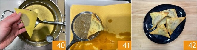 Frittiert wenige Stücke gleichzeitig, indem ihr sie in das auf 170° vorgeheizte heiße Öl taucht 40. Wenn sie nach etwa zwei Minuten gut gebräunt sind, auf Küchenpapier abtropfen lassen 41, um das überschüssige Öl zu entfernen. Abkühlen lassen und servieren 42.