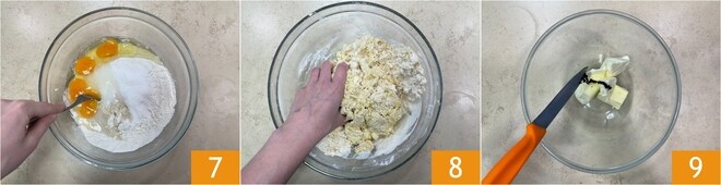 Beginnt mit einem Löffel 7 zu kneten und arbeitet dann ein paar Minuten mit den Händen 8. Gebt die weiche Butter in eine Schüssel, fügt die Vanilleschotenkerne 7 hinzu und zerdrückt sie mit einer Gabel.