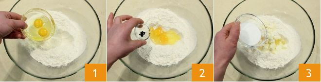 Um die Karnevalsmasken zuzubereiten, beginnen Sie mit dem Teig: In einer Schüssel das Mehl sieben und die Eier hinzugeben 1, dann die Samen einer Vanilleschote hinzufügen (Sie können sie extrahieren, indem Sie die Schote der Länge nach aufschneiden) 2; auch die Butter in Stückchen, eine Prise Salz und den Zucker hinzugeben 3.
