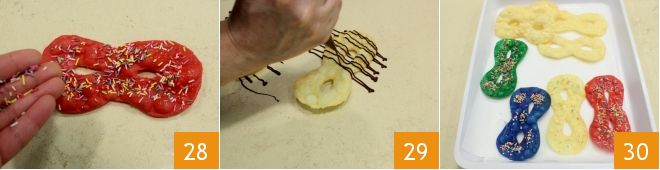 und mit bunten Streuseln dekorieren 28. Sie können auch die weißen Masken mit Honig bestreichen oder sie mit geschmolzener dunkler Schokolade im Wasserbad dekorieren, die in einen Spritzbeutel gegeben wird 29, oder mit Puderzucker bestäuben. Ihre Karnevalsmasken sind bereit, vernascht zu werden 30.