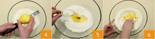 Die Schale einer Zitrone abreiben 4 und zuletzt den Wein hinzufügen 5. Beginnen Sie, die Zutaten in der Schüssel zu vermengen 6