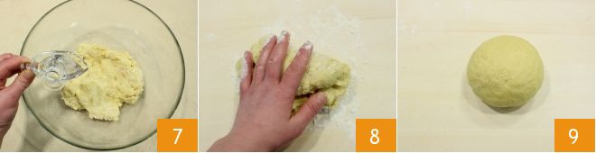 Wenn der Teig homogener geworden ist, fügen Sie nach und nach die Wassermenge hinzu 7, dann weiter kneten und auf eine leicht bemehlte Arbeitsfläche geben 8. Eine Kugel formen 9.