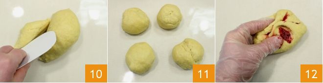 Mit einem Spatel 10 den Teig in 4 Kugeln zu je 150 g teilen 11: Lassen Sie eine Kugel weiß, während Sie die anderen mit flüssigen Lebensmittelfarben einfärben: eine rot 12