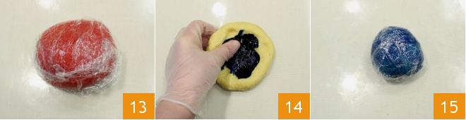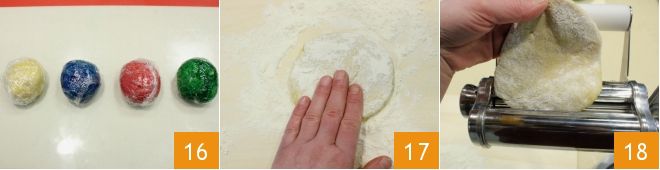 Den eingefärbten Teig in Frischhaltefolie wickeln 13, dann eine andere Kugel grün und eine blau einfärben (14-15).